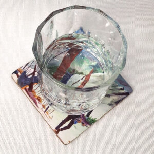 I make each wooden coaster by hand, one at a time. I use a special decoupage technique to put my own painting — which I first made on canvas — onto the coaster. Because I make every coaster myself, each one is a little different and unique.